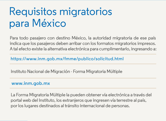 Para todo pasajero con destino Mexico, la autoridad migratoria de ese pais indica que los pasajeros deben arribar con los formatos migratorios impresos.